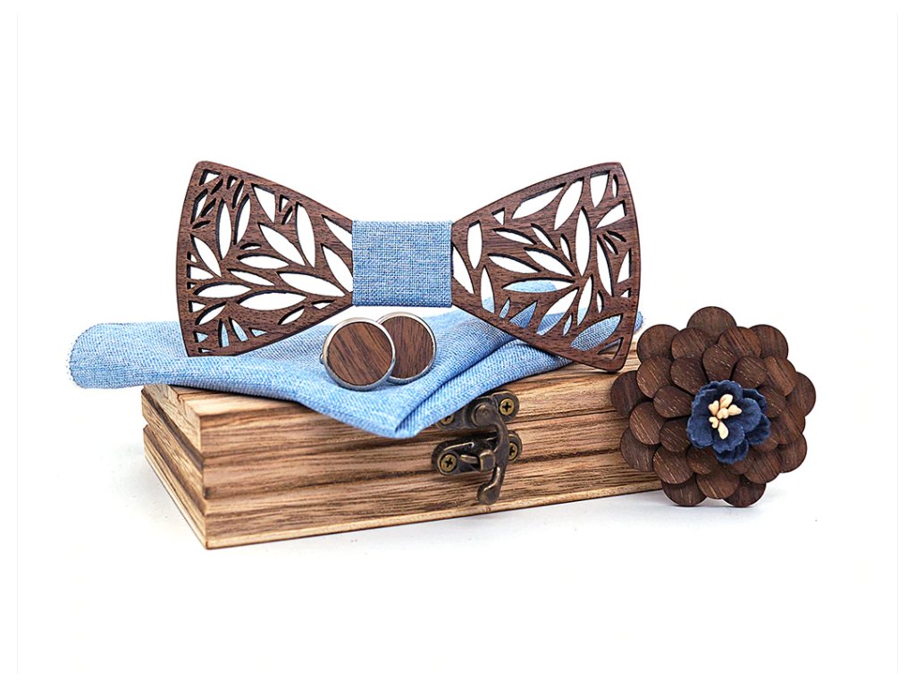 Een houten vlinderstrik van ruw hout met een origineel ontwerp vindt zijn plek in de kast van elke gentleman. De verpakking bevat een houten geschenkdoos, een broche en een zakdoek met hetzelfde patroon.