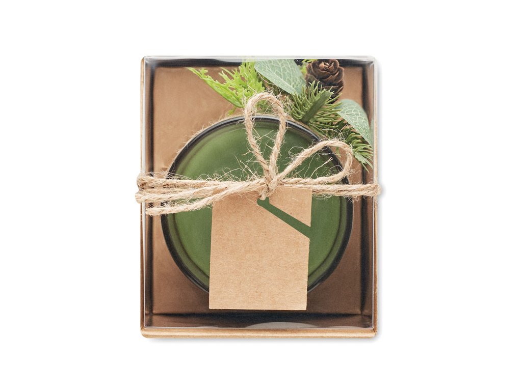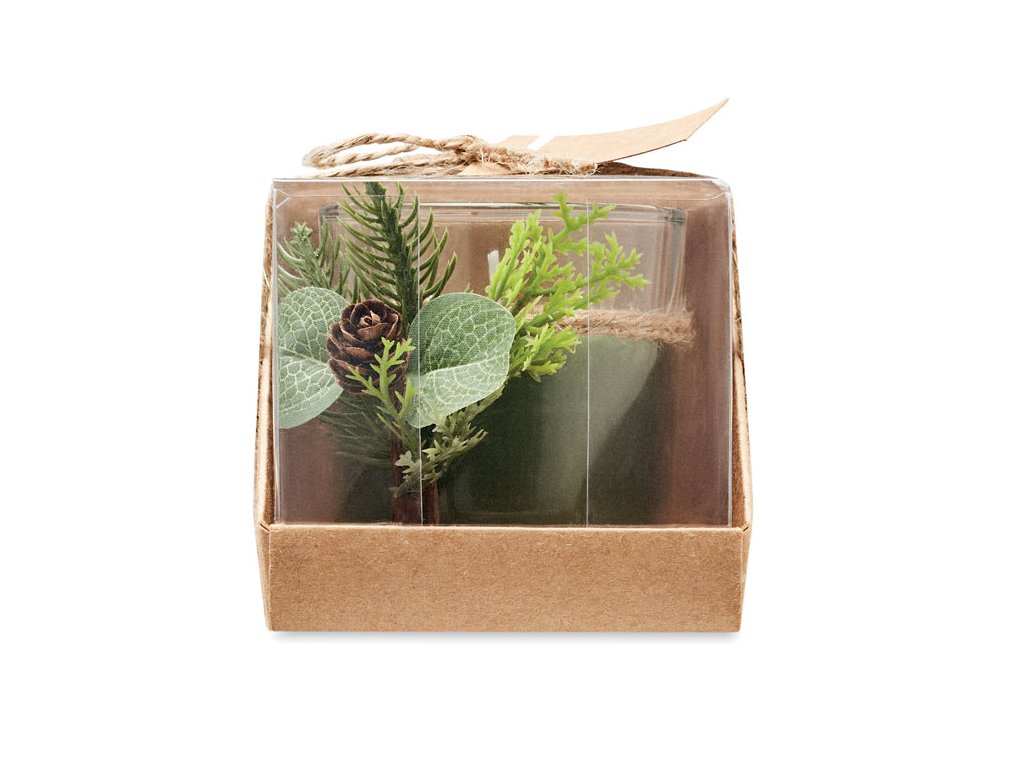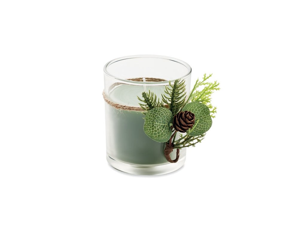 De glazen kaarsenhouder, versierd met dennenappels, takjes, bessen en sterretjes, schittert prachtig in het kaarslicht en creëert de juiste sfeer.