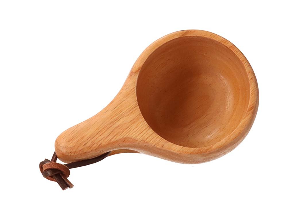 Dankzij het leren koord kun je de houten kuksa bijvoorbeeld aan je rugzak hangen.