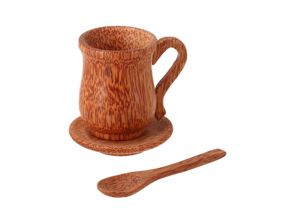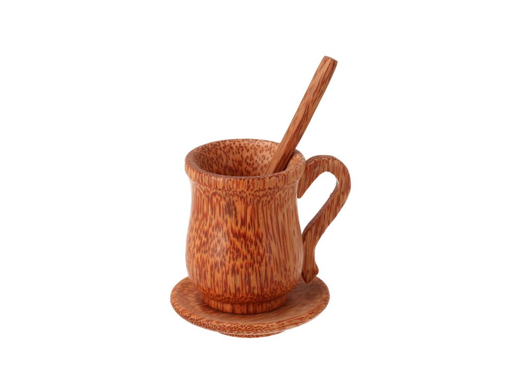 De mok van ongewoon kokos hout valt op het eerste gezicht op door zijn opvallende tekening, die elk stuk in een origineel verandert. Er is ook een kleine lepel en een schoteltje van hetzelfde materiaal inbegrepen.