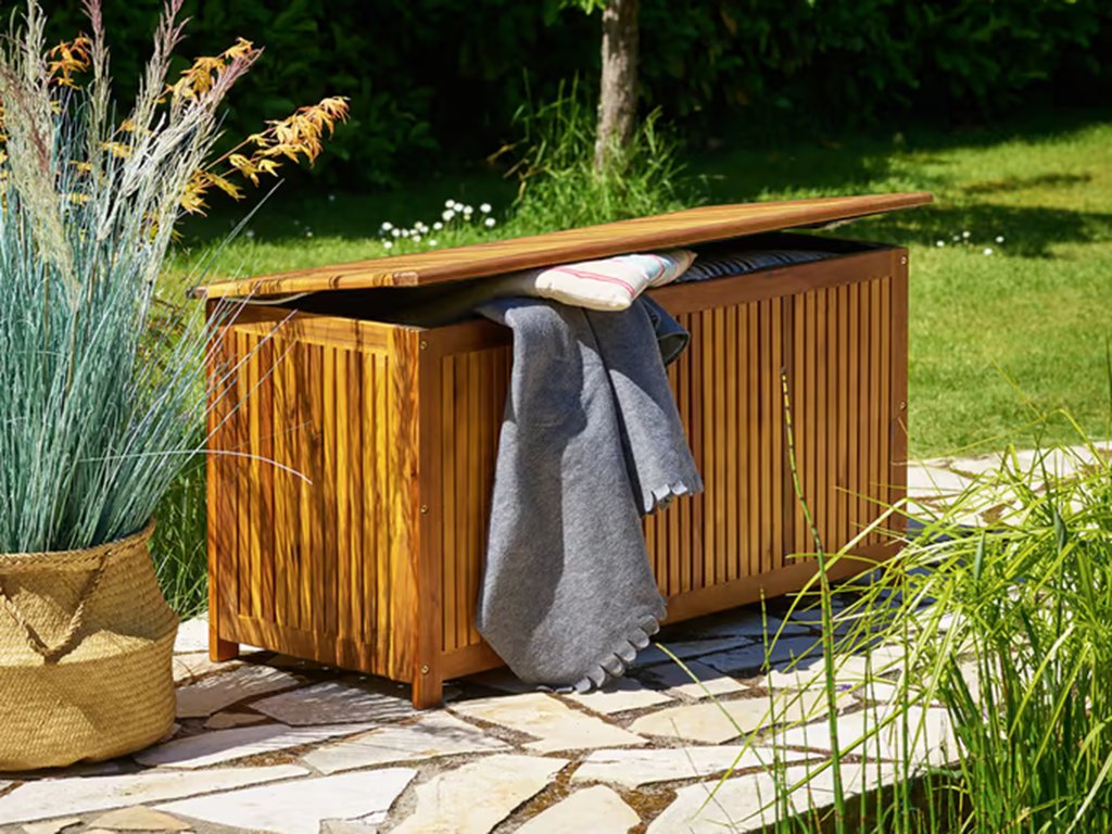Deze ruime opbergbox voor in de tuin, gemaakt van massief acaciahout, is de ideale oplossing voor het opbergen van zitkussens, sierkussens, tuinmeubelhoezen, gereedschap of kinderspeelgoed. Dankzij het praktische ontwerp houdt hij uw tuin, terras of balkon netjes en opgeruimd.
