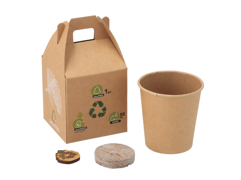 Plant uw eigen boom! De set bevat dennenzaadjes, gedroogde aarde en een kartonnen bloempot.