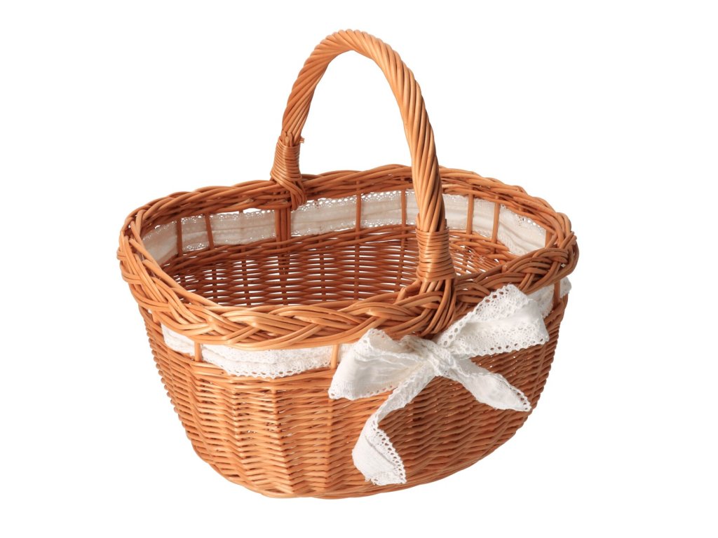 Een handgeweven winkelmand met een elegante witte strik, waarin de boodschappen voor het hele gezin passen. Wees ook in gewone situaties buitengewoon stijlvol.