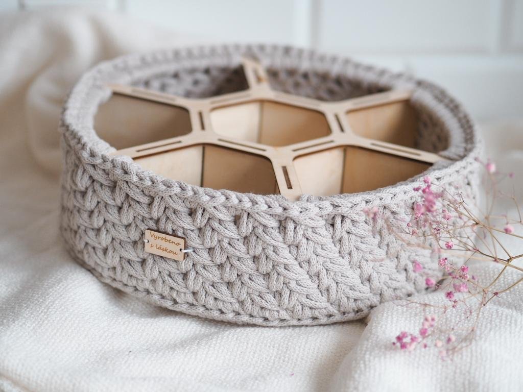 De constructie van berken multiplex met een dikte van 3 mm dient als basis voor de gehaakte organizer. In de vakken kun je thee, cosmetica, kantoorbenodigdheden en allerlei kleine spulletjes opbergen.