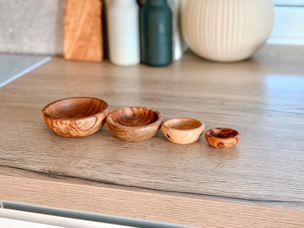 Creëer een mediterrane sfeer ook bij u thuis. Deze unieke set van olijfhouten kommen voor smaakmakers en kruiden past in elk interieur.