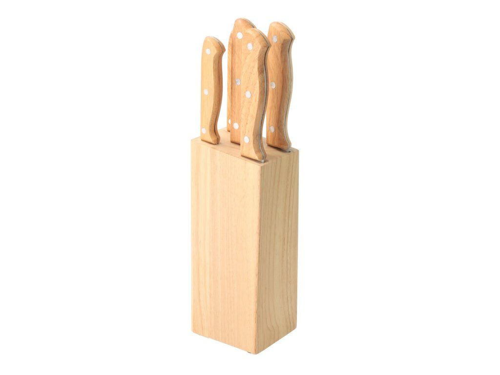 De set bevat een koksmes, een snijmes, een broodmes, een ontbeendingsmes, een universeel mes en een houten blok voor het opslaan van de messen.