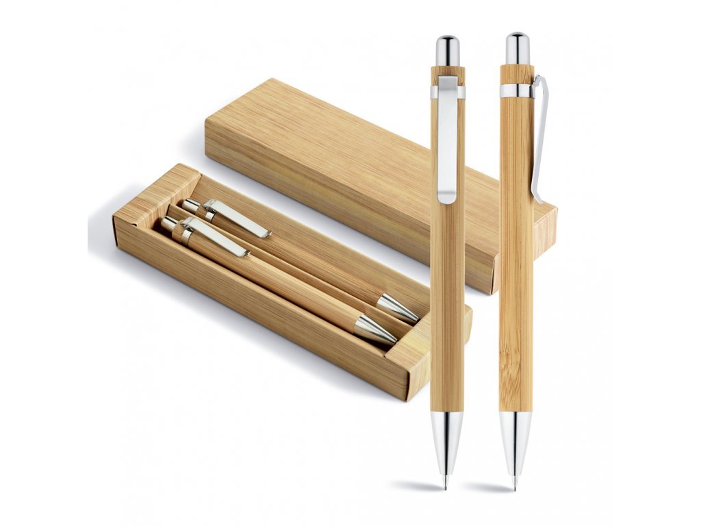 Een elegante schrijverset voor een belangrijke klant is altijd een geweldig cadeau. De bamboe set in een kartonnen doos bestaat uit een balpen en een mechanisch potlood van 0,7 mm.