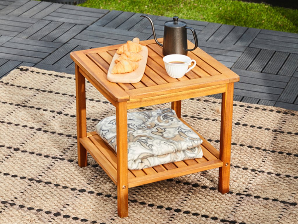 De elegante bijzettafel is gemaakt van voorgeolied en weerbestendig acaciahout. De tafel heeft een praktische onderste plank die extra opbergruimte biedt voor boeken, decoraties of kleine spullen. Dankzij het universele ontwerp is de tafel geschikt voor de tuin, het terras, het balkon en voor binnengebruik.