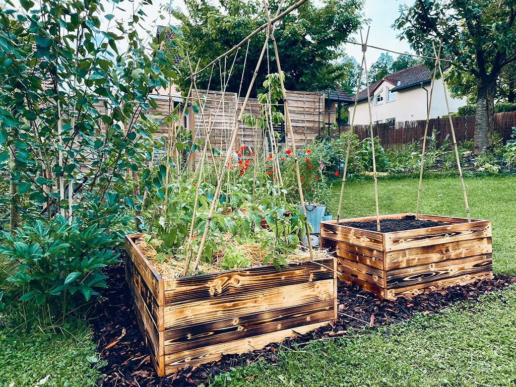 Houten verhoogde tuin van het Tsjechische merk ATMOWOOD = de perfecte tuin binnen handbereik. Het gebrande oppervlak van het hout is beter bestand tegen weersinvloeden en houtbeschadigende insecten.