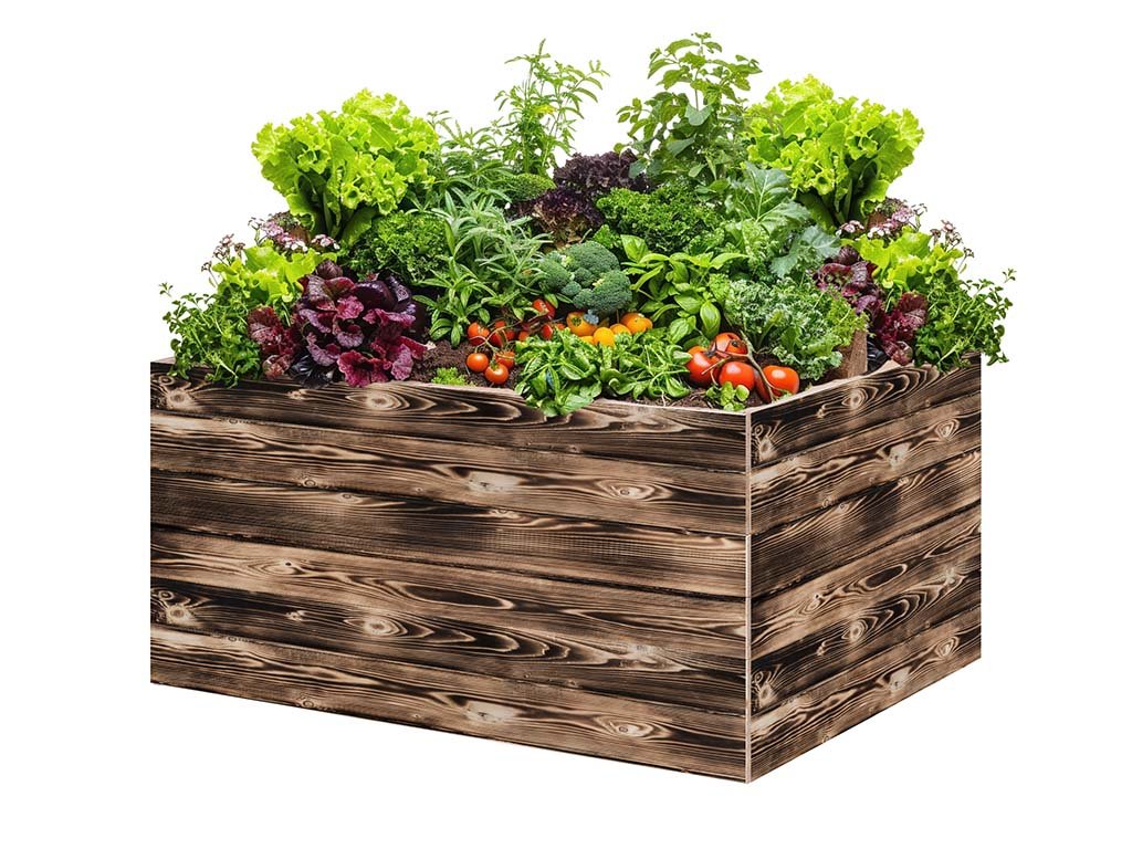 Houten verhoogde tuinbed van het Tsjechische merk ATMOWOOD = de droomtuin binnen handbereik. Het gebrande oppervlak van het hout is beter bestand tegen weersinvloeden en houtbeschadigende insecten.