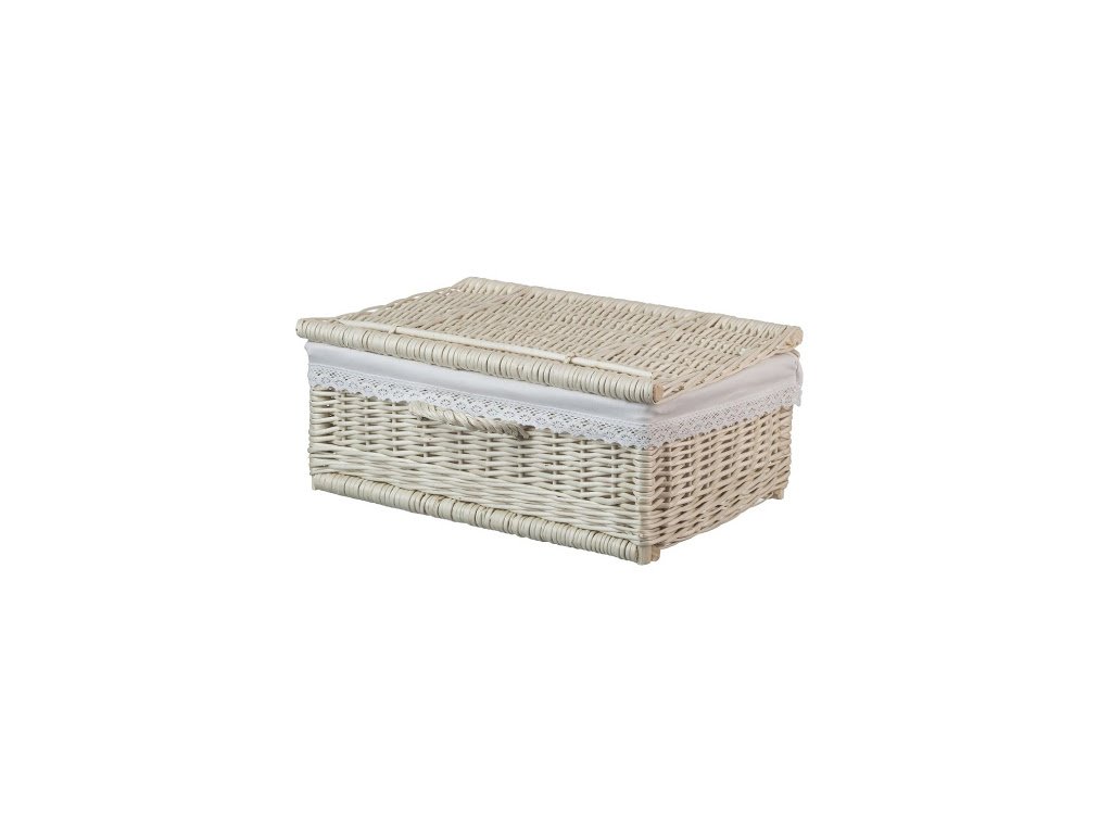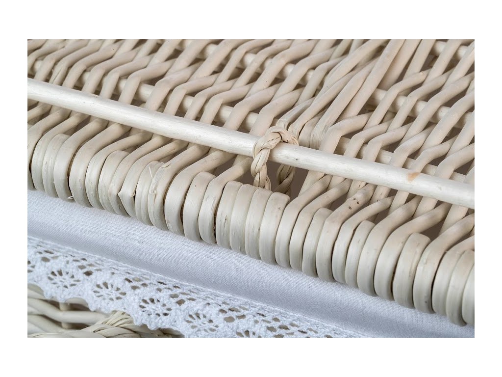 Lichte vierkante mand van geschilde wilgentakken met een elegante kant, die alles verbergt wat je niet in het zicht wilt hebben. De mand is bekleed met een witte stof die uitneembaar is en af en toe kan worden gewassen.